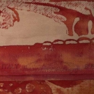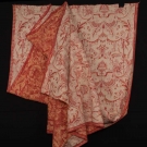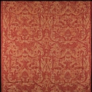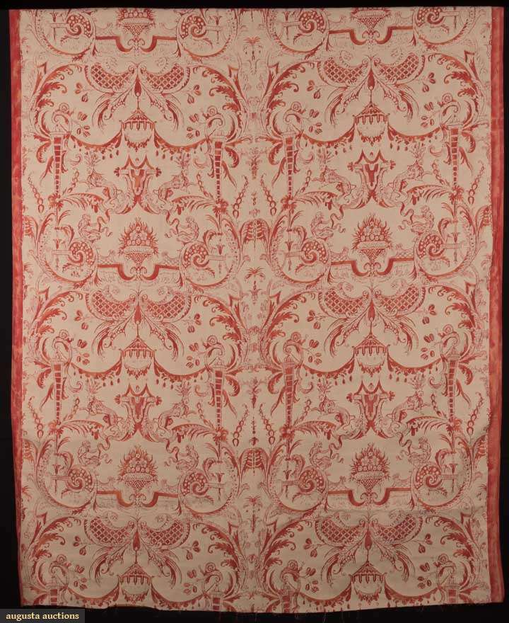 Fortuny "Mazzarino" yardage in bittersweet & ivory colorway w/ floral basket, swag, mythical creature & snail motif, stamped on selvage "Made in Italy, Mariano Fortuny, Depose", WD 57", L 175", (few small holes on selvage, rough edges, 2" x 2" swatch cut from 1 end) excellent.