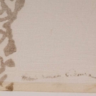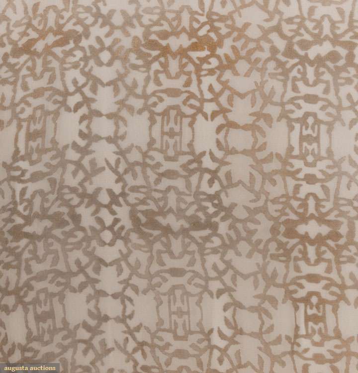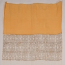 Ivory & saffron silk chiffon scarf w/ 18" gold stenciling at both ends, stenciled "Gallenga" at 1 edge, WD 38", L 98", (few small holes, smattering of hole at 1 end, 2" stain at one selvage, stenciling wearing) good.