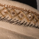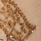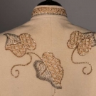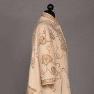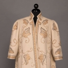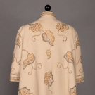 Ivory cashmere w/ gold sequins & silver tinsel, leaf & vine design, notched collar, open front, bracelet length sleeves, 2 slit pockets at front Hs, silk lining, label "Originala Stroock" & "100% Kashmir", L 44",(moths holes to back right SH & back left H, shortened?) good.