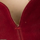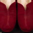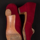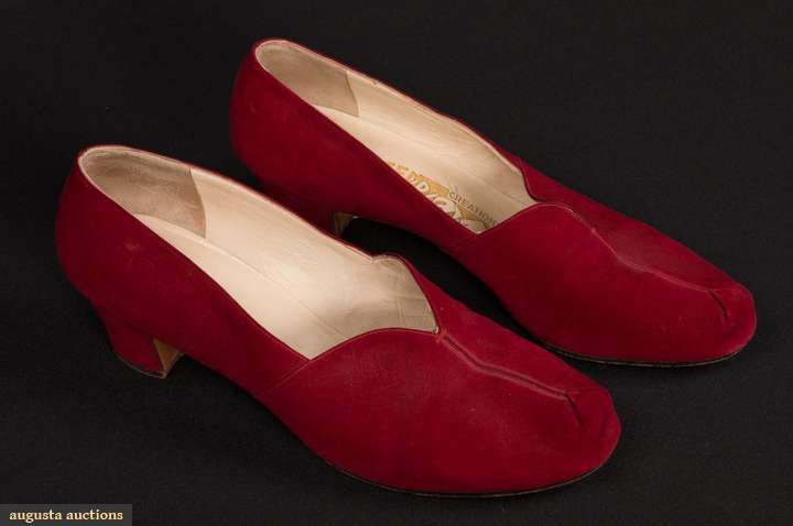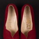 Raspberry suede pumps w/ Cuban heel, label "Ferragamo", (some slight wear to suede, spot on vamp of right shoe) very good.