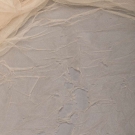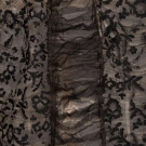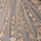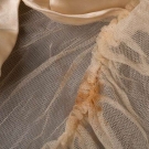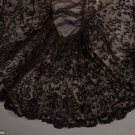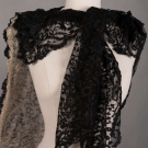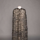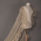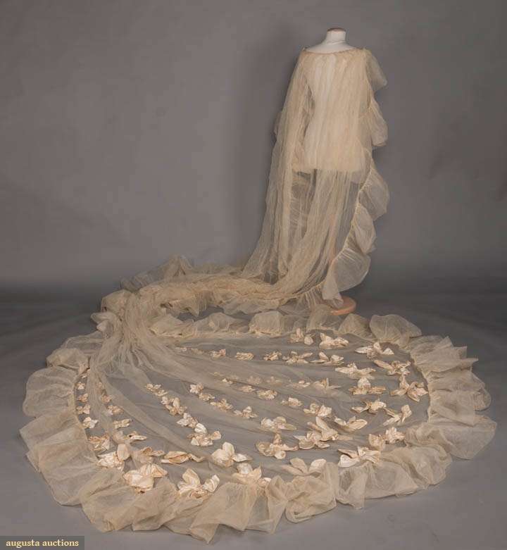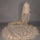 1920s cathedral length tulle train w/ satin flowers to lower half embellished w/ pearls, L 224", WD 57-122", (many holes in net in center of train, few brown stains) fair; black lace evening train w/ weighted hem lined in cream ruched chiffon, self tie CF, 1900-1910, 68"x24", (tears in net, small holes to chiffon) good.