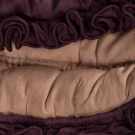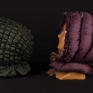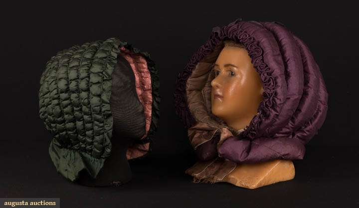 Both puff quilted & w/ neck peplum: 1 purple w/ applied double row piped edge gathered frills, chine checked ribbon tie, purple ribbon festoons at apex of each quilted row, depth 12", diameter 14", (light 0.5” spot stain at CB, fraying & stained ribbon, ribbon probably later) very good; 1 deep forest green w/ pink glazed cotton lining, depth 10.5", diameter 11", (shattering at top & edges) fair.