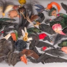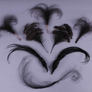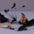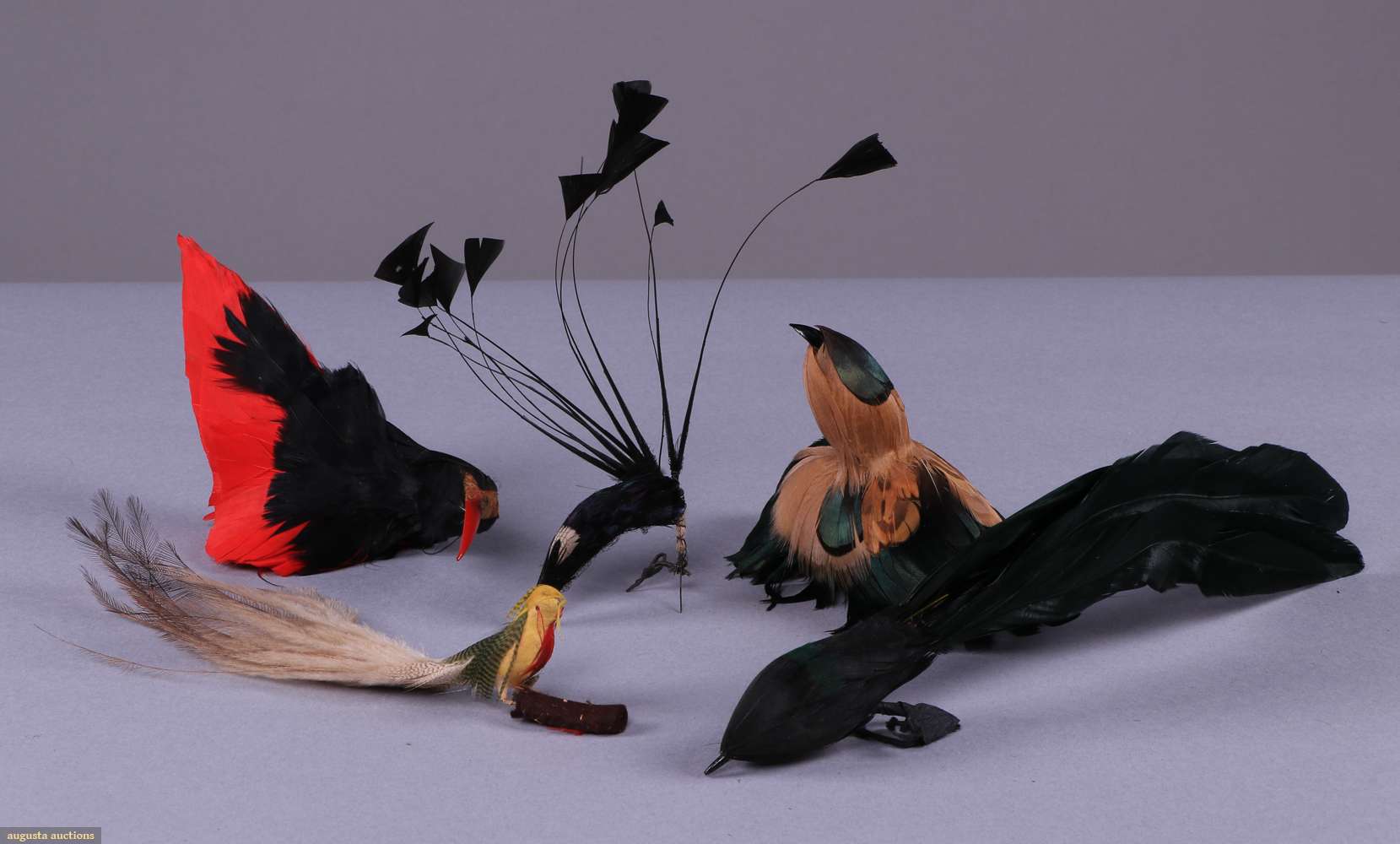 Over 4 dozen millinery trims, all w/ natural, dyed & manipulated feathers into birds, florets, festoons & cockaids to be used as hat trimmings, 1900-1940s, some labeled "Drucker Brothers", "Danciger Bros, Incorporated", & "Made in France", 1.5" x 45"- 5.5"- 15.5", (some w/ missing or bent feathers) all fair-excellent.