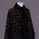 1 black cisele velvet dolman style jacket w/ brown patterned ground & bud motif, stand collar, CF opening & hem trimmed w/ black chenille & covered corded spheres, label "Maison Dieulafait", SH-SH 17", L 25"-29.5", (W tie detached, slight fringe loss) very good; 1 handmade fine wool taupe SH cape, SH-SH 16", L 18"-22", (3 tiny holes right CF & 1 right SH, CB trim loose) good; 1 handmade purple silk taffeta dolman style cape w/ 3 tiered brocaded ribbon ruffles, SH-SH 16", L 22.5"-29", (trim detaching 4.5" right SH, 0.75" & 1" seam openings at left CF, discoloration at front) good; 1 purple to green quilted changeante cape, SH-SH 18.5", L 27.5", (shattering & worn edges, fading, 3.5" seam opening left CF, tiny-1" holes in lining) fair.