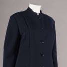 2-pc long semi-fitted jacket & pants that fit under heel in navy wool synthetic blend, labeled "Queiller, Western Germany", B 40", W 31", Ins 29" all the way to heel, Jkt W 36", L 28", excellent. Museum at FIT.