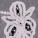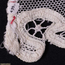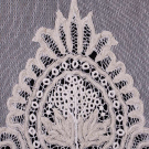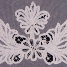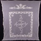 1 net bed curtain w/ tape lace insertions, needle fillings & applied leaves & florals w/ cording, 83" x 83.5", (scattered small holes, 1.25" repair); 1 twin sized bed covering for four poster bed w/ inserted tape lace center w/ needle fillings & same applied ribbon leaves, corded tendrils & tape lace floral, 63" x 100", (few small holes at edges, 2.5" section separating from trim at edge) both good.
