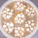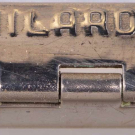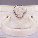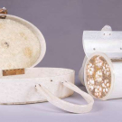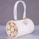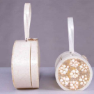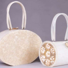1 white pearlescent oval hatbox style w/ single split & twist handle, unlabeled Wilardy style no. 1473, 1950s, 7" x 11" x 3.5" w/ 5.5" tall handle, (lid warped, metal tarnished, scratches, missing mirror) good; 1 white pearlescent cylinder w/ “Deco Jewels Collection” motif at either end & at closure, split & twist handle, "Wilardy" stamped on hinge, featured in "Carry Me" page 86, 5" x 7" x 5.25" w/ 5.5" tall handle, (discoloration on side panels & clasp, bead loss, light scratches) veood.