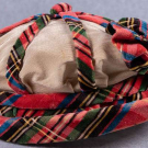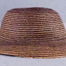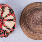 1 Balmoral plaid silk velvet hat w/ CF rosette, rolled brim, sectional bias plaid bands to single self-covered button over cream ribbed silk, late 1850s, circ. 19", Ht 4.5", size 6, (spot stains to cream fabric at crown, velvet worn around brim, lining mostly shattered & detached) good; 1 dyed straw hat, 1860s, circ. 17.25", Ht 3.5", (edges of brim chipped, lining unfinished w/ holes & spot stains) very good.