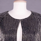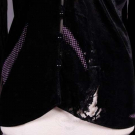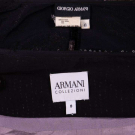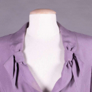1 printed velvet jacket w/ botanical purple, grey & pixelated lavender motifs, label "Giorgio Armani", B 44", L 26.5", (8" stain deteriorating fabric left front H, two 0.5" holes left B) fair; 1 black silk georgette heavily beaded w/ short crystal bugle beads in horizontal & chevron bands, raglan sleeve, scoop neck w/ single hook & eye closure at throat, label "Armani Collection", B 44", L 23", (minor bead loss, tiny-0.5" stains CF) very good; 1 lilac silk flared jacket w/ scalloped front hem, shawl collar gathered to tabbed band ties, single butterfly button w/ rhinestone accented wings, label "Giorgio Armani", B 42", W 36", L 25", (0.25"-1" light stains, 2.5" light stain left H) good. From the Estate of Monique Van Vooren.
