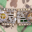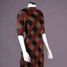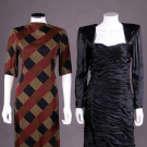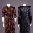 1 jersey day dress printed w/ diagonal wide ribbon stripe plaid w/ elbow length sleeves, CB W tie & zip closure, 1960s, label "Pauline Trigère", B 41", W 26"-34", L 42.5", (paint at zip chipping) excellent; 1 black silk in woven imitation ostrich leather pattern w/ sweetheart neckline, controlled draped pleating to body & narrow knife pleated hem ruffle, extended horizontal SHs knife pleated to armscye, zip at cuffs & CB, 1980s, label "Ungaro Parallele Paris", B 35.5", W 30", L 41", (tiny spot stains & 0.25" worn spot at zip) very good. Ohio State University Historic Costume & Textiles Collection.