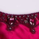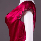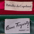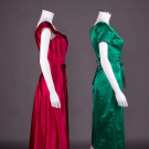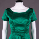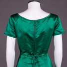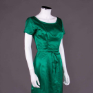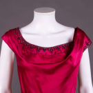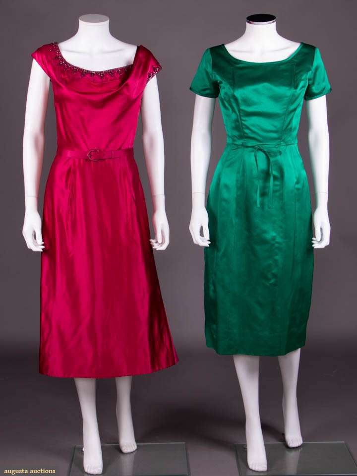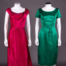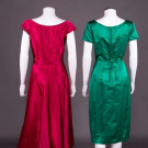 1 magenta silk satin w/ asymmetrical scoop neckline embellished w/ marquee pink prong set paste, magenta seed beads & rhinestones from right shoulder across neckline & at wide left shoulder strap, fitted W, original self covered leather belt, slightly flared calf-length skirt, left side seam closure, label "Pattulo-Jo Copeland", B 38", W 27", L 47", (bead loss, underarm stains, seam opening at SH strap); 1 emerald green silk satin w/ wide scoop neck, short sleeve, princess line W w/ CF & CB inserted self ties, center back zip closure, label "Anne Fogarty Margot Inc.", B 37", W 25.5", L 44", (0.75" stain lap & 0.25" back right SH blade) both very good. Ohio State University Historic Costume & Textiles Collection.