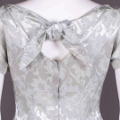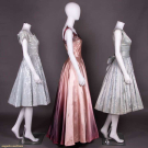 1 pale blue monochrome damask in lily motif w/ stylized scalloped neckline, broad CB tie, dolman cap sleeves, fitted empire W line into flared skirt, label "Ro-Nel of California", B 35", W 27", L 40.5"; 1 ombré blush to aubergine satin w/ sweetheart neckine, fitted sequined bodice, broad SH straps, w/ sequined faux button closure, floor-length circle skirt, label "Dorothy Lord Boston", B 33.5", W 28", L 60", (sm. Stains & pulls, sequin loss, discolored hem); 1 sleeveless pale blue satin w/ weft pattern sprig stripe in Marguerite motif, bateau neck into V at CB, fitted W yoke & oversized self bow at CB, flared knife-pleated skirt & integrated tulle petticoat, label " Best & Co", B 34.5", W 25.5", L 43", (sm. stains) all good-excellent.