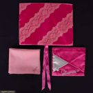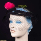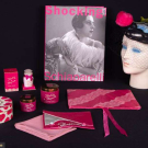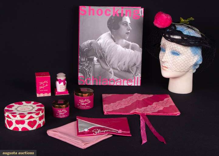 1 “Shocking! The Art and Fashion of Elisa Schiaparelli” by Dilys Blum, 11”x13.5"x1.25", (jacket worn, light wear & marks); 4 cosmetic powders or creams, 1950s: cleansing cream, 2.75”x2.5", (tarnish), 1 satchet powder, 2.125"x3.25", 1 night cream, 2.25"x1.75", (tarnish), 1 dusting powder, 5.125"x2.125", (puff stained); 1 large pink lingerie case w/ printed lace pattern, 11"x8.75", (ties worn, 5.75" seam opening lining), 1 silk twill pink scarf, 19.25"x20", (1.25" discolored stripe), 1 small satin handkerchief case, 7"x6", (tiny pulls), 1 fascinator w/ feathered cabbage rose, 8"x10.5"x3", (misshapen, few broken brides), (all w/ minor wear, discoloration, chips/scratches) all good- very good.