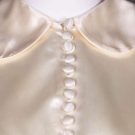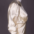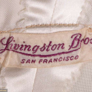 Champagne peau de soie wedding dress w/ draped choir-boy collar, CF self-covered buttons, long gigot inspired sleeves tapering to fitted pointed cuff, bodice gathered under bust & falling at CB to V at CB, full attached skirt w/ circular train, finger loop at either side of train, horsehair hem facing, label "Livingston Bros. San Francisco", B 38", W 29", L 104", (tiny pulls, button clasps worn on cuffs, zipper tarnish, small spot stains hem & train, hem mesh lining very worn & detaching, top button loop detached, scuffs to front at W) good.