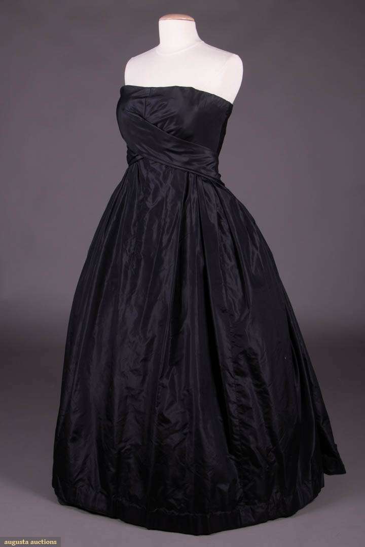 Black strapless silk taffeta ballgown w/ asymmetrical wrapped front bodice formed from crossed back skirt panels, full slightly trained skirt, c. 1958, label "Christian Dior, London", couture # "4322", "Holt Renfrew & Company Limited", B 40", W 31", L 48.5"-52", (bones poking through, 0.25"-0.75" tears in hem or zip facing, tacks broken at neckline, 1.5" line stain at seat, few tiny-0.25" stains, petticoat & bodice structure worn) very good. Provenance: Elena Jofré Serey de Chávez (1908-1987) of Santiago, Chile, wife of Chilean diplomat who served in consular posts in Peru, Canada & the USA, including as Consul General in NYC. Commissioned oil painting, dated 1965.