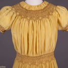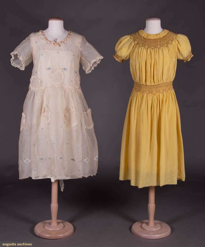 1 Piña fiber w/ Heilmann embroidered bouquets of blue forget-me-nots, tucked circlets edged w/ lace & appliqué to from W & around skirt, vertical bow at CB trimmed w/ extended tail trimmed w/ ruched lace, mid 1920s, B 40", W 40.5", L 41", (discoloration, tiny-sm holes esp at hem, few tiny spot stains, sash at back W detaching); 1 yellow silk crepe smocked w/ cinnamon silk at neckline, sleeves cuffs & W, CF brown ball buttons, CB neck opening, B 49", W 36", L 42", (light underarm stains, neckline facing worn, 0.25"-1.5" stains to skirt, raw hem) both good.