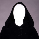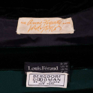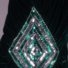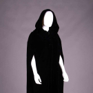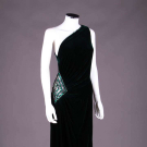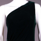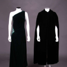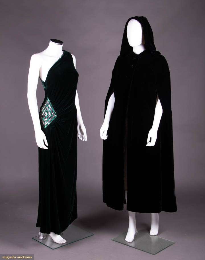 Emerald green velvet evening sheath w/ draped bodice from single SH gathered to embroidered diamond at right H w/ green & silver flat sequins & paired rows of silvered bugle beads, label "Louis Féraud", modern, B 40", W 30", B 40", W 30", L 54.5", (wear to beads & sequins, minor crushing at SH) excellent; 1 long black velvet cloak w/ deep hood, 3 CF self-covered button & arm slits, label "The Anne Fogarty Room Lord & Taylor", SH-SH 19", L 51", (light crushing throughout w/ more significant spot CF neckline) excellent.