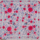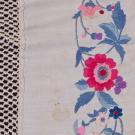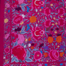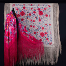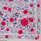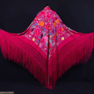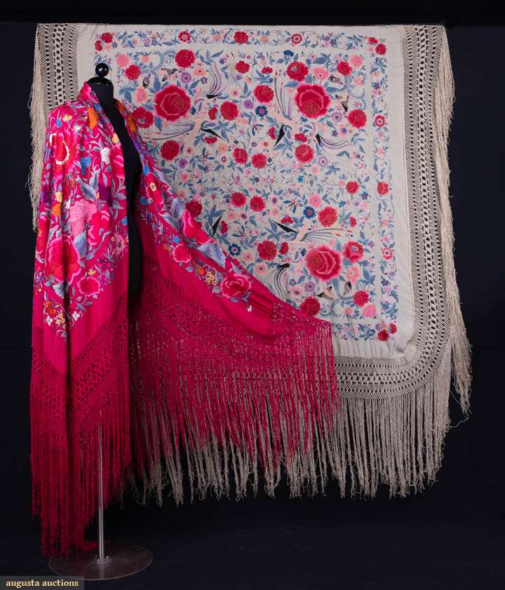 Two silk canton shawls both w/ silk embroidery: 1 cream w/ rose, flower & bird motifs, 52" x 56" w/ 22" fringe, (fringe messy, pulls, tiny holes, tiny-0.5" spot stains, 1.25" x 1" stain right side, 0.5" hole) & 1 fuchsia w/ multicolored florals, 62" x 62" w/ 21" fringe, (messy fringe, pulls/wear to embroidery, tiny-0.5" spot stains) both good.