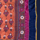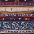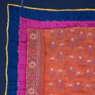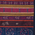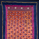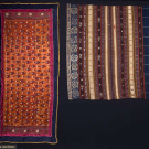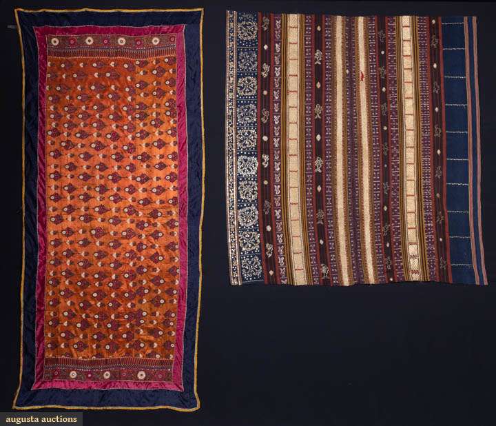 1 silk warp face stripe w/ gold-tone metallic embroidery & sequins, Indonesia, 47.5" x 51.5", (pulls, edges raw, light wear, 2" repair center, some embroidery loss) good; 1 chainstitch embroidered silk pieced panel, India, early-mid 19th C, 35.5” x 75", (4 repairs near center, weft loss, few tiny holes/spot stains) fair.