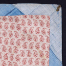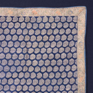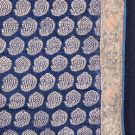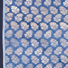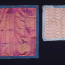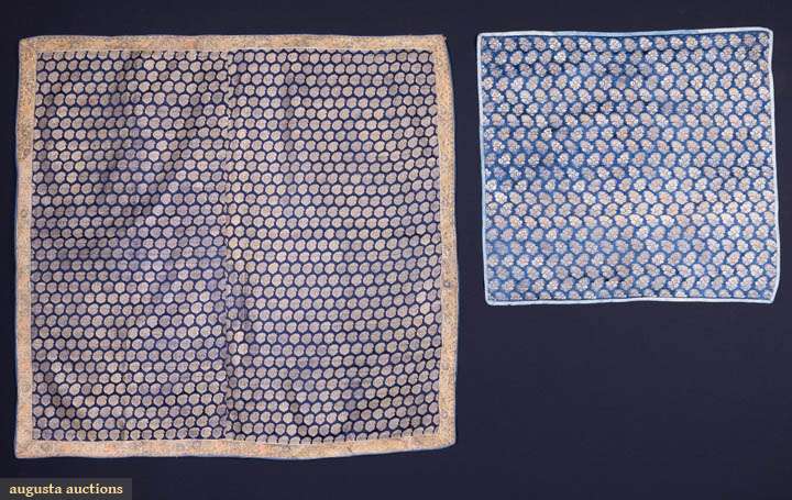 1 blue & cream brocade w/ block printed flowered boteh backing, Early 19th C, 28.5" x 26", (wear, shattering to binding, few pulls) good; 1 dark blue w/ metallic brocade, appliqué silk brocade border w/ bird & flower motif probably 17th C, panel 18th C, lined w/ silk sarcenet, 40” x 42", (backing stained, light wear, border worn, 2.5" red stain near top edge) very good.