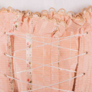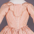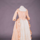 Both silk taffeta & in original unaltered state: 1 cream w/ ombré green & rust stripe, double narrow gathered ruched self-band at CF & around neck open & single ruched band at back of neck, deep knife pleated CB skirt, 1770s, B 33.5", W 28", L 64", (heav wear, trim detaching, stains/discoloration, tiny-1" holes, 11" of skirt trim removed); 1 pink w/ satin warp faced vertical stripes, passementerie corded edge fur below w/ collar decoration at back similar to scalloped engageante sleeve, eyelet cross lacing front, spaced box pleats at either side of CF continuing around hem, bodice lined w/ linen, 1780s, B 34", W 26.75", L 62", (15"x12" mesh sewn in left H to stabilize shattering & 1"x1.5" right H, shattering, left boning at laces removed, worn) both poor