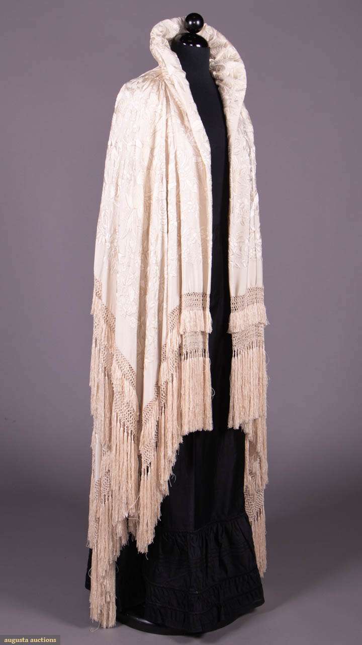 Mantón de manila reversible embroidered silk shawl, folded & manipulated to create tiered cape w/ gathered & stuffed collar, double graduated knotted fringe, 39” x 65" w/ 13" fringe, (messy fringe, light wear & pulls to embroidery, tiny-0.25" spot stains) very good.