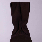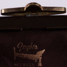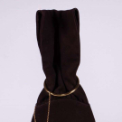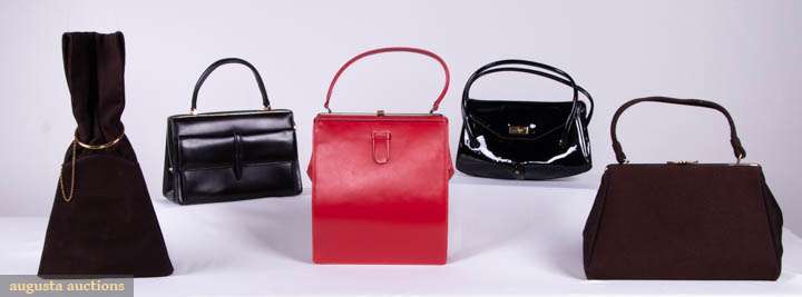 1 red leather w/ brass hardware, label "Crown-Belmont Bags, Chasnoff", 10.25" x 15.5" x 2.75", (light wear & scratches); 1 brown suede modern miser adaptation pouch purse, label "Lewis", 9" x 17" x 5", (light wear, coinpurse clasp oxidizing); 1 black vinyl double handbag w/ toggle strap to bottom, lined w/ grosgrain, 11" x 10" x 4.5", (lining dirty & scratched, tiny spot stains); 1 brown broadcloth w/ satin lining, change purse on elastic, label "Ingber, Made in USA", 12.5" x 8" x 2"; 1 black leather hidden clasp w/ side mechanism, 10" x 3.75" x 11", (lightly scuffed, wear at base corners), (all w/ scratched or tarnished metal) all good-very good.
