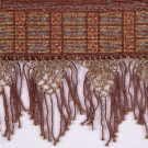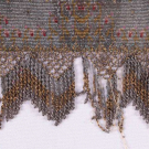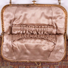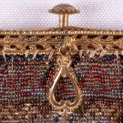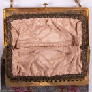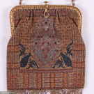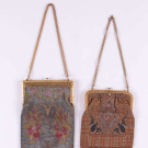 Both woven: 1 multicolored steel cut beaded in double floral bouquet bordered by niches, netted base w/ twisted looped fringe, gold tone flowered openwork frieze frame, double chain handle, mauve faille lining w/ metallic galloon finish, 6" x 11", (bead loss esp. in fringe, frame tarnish); 1 w/ facetted & unfacetted beaded gold, silver, copper, black & sapphire blue beads w/ zoomorphic motif on grid w/ geometric fillings & diapered ground, goldstone open work frame w/ leaf motif, double chain handle, netted fringe, mauve satin lining, 6” x 9", (bead loss esp. in fringe, light frame tarnish & slightly warped) both very good-excellent.