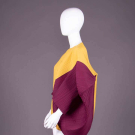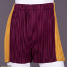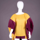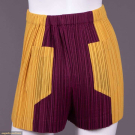 Both in canary yellow & wine red pleated polyester, neck slit & attched straight glove length sleeves, dress B up to 54", L 25.5"-32", matching color block shorts w/ 2 patch pockets at seat, W 22"-36", L 15", inseam 2.25", (both w/ light wear) excellent. Similar piece exhibited in "MIYAKE ISSEY EXHIBITION", at the National Art Center, Tokyo, 2016, exhibit # 16 & featured in exhibition catalog & Metropolitan Museum exhibit "MANUS x MACHINA Fashion in the Age of Technology", May 5-September 5, 2016.