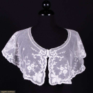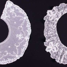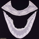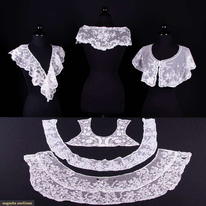 Six chainstitch or Tambour embroidered natural or stylized florals & Baroque inspired motifs on net grounds Wd range 1"-8", circ range 26.5"-106": 1 shaped bertha, (ends & edges cut); ); 1 iris motif collar; 1 bodice insert; 1 narrow collar; 1 w/ tiered ruffle; 1 large draped bertha; 1 bertha collar w/ daisy motif, ”, (most w/ light wear & fraying, tiny-small holes, some w/ 0.25"- 1.5" holes/repair); Six whitework embroidered collar, Wd range 1.75"-8", circ's 14"-21.5": 1 Indian whitework w/ raised florals, 1830s; 1 Indian whitework w/ fine drawn thread work, 1840s; 1 broad w/ lace insertions, 1890-1910; 1 Heileman machine w/ broaderie anglaise; 1 partial Indian collar, 1830s; 1 whitework, (most w/ light wear/sm holes/repairs) good-excellent