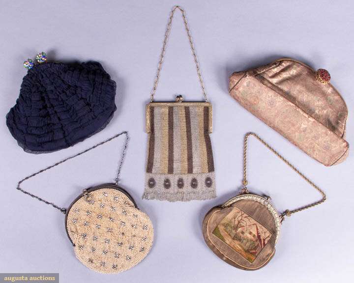 1 faux pearls & prong set rhinestones, 1920s, stamped "E. Gauthier, Paris", 5.25"x5.75", (lining shattered, frame slightly warped, missing few stones); 1 striped mesh w/ blue cabochon closure & manipulated mesh medallions, stamped "Whiting & Davis Co." & "Soldered Mesh", 4"x6.25", (broken hinge, missing chain links); 1 navy blue ruched crepe de chine w/ cloisonné medallions at snap closure & finger ring, 1930s, 8”x5.5"x2.5", (light lining stains); 1 Persian inspired gold lamé brocade w/ carved carnelian closure, 1940s, 8.5"x4.5"x2", (light wear); 1 small w/ Austrian petit point farmhouse & floral motifs, 5"x5", (frame warped, lamé fraying at frame, tiny hole), (all w/ tarnish) all good-excellent