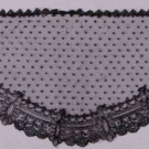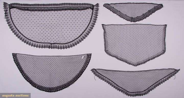 1 triangular head veil w/ wide edging & spot motif ground, Wd 27", L 9.25"; 1 narrow semi circle hat veil w/ drawstring, Wd 43", L 12"; 1 demilune w/ floral border & spot motif ground, Wd 34.5", L 16", (1.5" hole 1 corner, no drawstring); 1 bonnet veil w/ squared off top edge, floral & picot vine edge, L 12.5"-19.5", L 31.5", (no drawstring); 1 Chantilly lace demilune shawl w/ scalloped lace edging, double row at neck w/ inserted ribbon drawstring, fine spot motif net, 1860s, Wd 42.5", L 20.5", (many tiny-0.25" holes), (all w/ small holes & lightly worn/fraying edges) all good-very good.