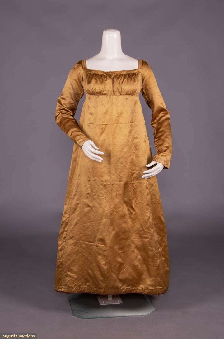 Raw sienna silk satin day dress w/ square flat neckline, high W gathered over B, one piece full length sleeve, cuff edged w/ woven patterned silk ribbon, CB opening w/ wire eyelets for lacing, back bodice lined w/ linen, hem edged w/ glazed cotton ribbon & heavy corded edge, B 40", W 30.25", L 47", (light stains to underarms, tiny-0.5" light spotting throughout, few tiny-0.25" holes, wear throughout esp SHs, underarms & B & sleeve seams & to cording at hem, 1" & 0.75" seam openings to SHs) good.