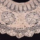 All silk Maltese lace: 1 light brown silk collar w/ white tie, inner circ. 28", outer 64.5", Wd 7.5", (0.5" repair left button opening, light stains, holes, wear); 1 long light brown silk collar, inner circ. 56", outer 117", Wd 6.5", (small holes/stains); 1 long cream silk collar w/ Maltese cross medallions, inner circ. 42", outer 88", Wd 7.5", (small spot stains); 1 cream silk collar w/ Maltese cross medallion, inner circ. 24", outer 64", Wd 7", (0.5" hole bottom edge, pulls); 1 small silk collar w/ medallions, probably regional variation, inner circ. 12.75", outer 39.25", Wd 5.5", (light stains, pulls, holes) all very good- excellent.