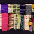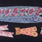71 pieces total: 1 pink & blue floral sash w/ tassels, 6.75" x 83"; 1 cream bow w/ blue & red flowers, 4.5" x 9.5"; 1 sheer yellow ribbon, Wd 3.5", L 4+ yds; 1 lamé & chine ribbon w/ roses, Wd 12", L 4+ yds; 1 cream velvet spool, label "Velours envers Satin, Made in Switzerland", Wd 0.375", L 5+ yds, (spool in poor condition); 1 cream moiré ribbon w/ hand painted poppies, Wd 4.5", L 86.5"; 1 cream satin belt, 2"-3.5" x 26", (removed closures); 1 wooden spool of brown satin ribbon, label "Kohn Adler & Co. Philadelphia", Wd 0.25", L 9+ yds, (label tearing), (most w/ raw ends/stains/discoloration/light wear) all fair-excellent. From the Collection of Doris Langley Moore.