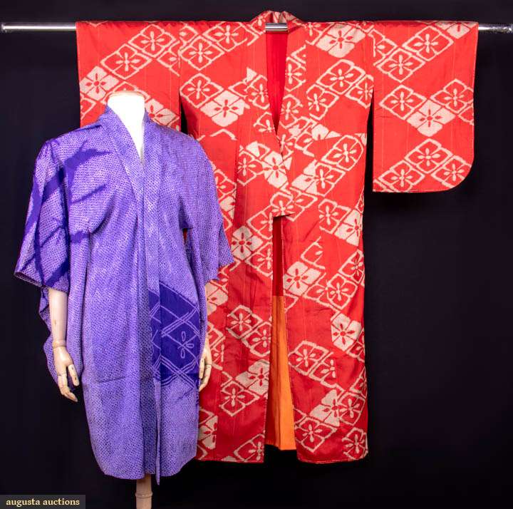 1 red akasuri kimono w/ stylized grey geometric florals, CH 45", L 53", (basting stitches present, few pulls/spot stains/holes, 1.75" stain right sleeve); 1 purple shibori on patterned silk ground w/ original packaging, CH 46", L 40", (creasing/wear to packaging, 2" stain left underarm, 0.5" & 2" inside right lapel at lap, light 0.75" stain right CH) both good.