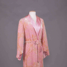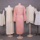 1 cream fine silk crepe de chine lingerie top w/ white lace trim, B 41", W 49", L 27", (tiny-0.25" holes); 1 long peach fine silk mousseline sleeveless nightgown w/ cream lace, B 33", W 62", L 52.5", (underarm stains, small holes/pulls, spot stains); 1 pink & orange chiffon velvet robe w/ floral design, lined in crepe back silk satin, B 49.5", W 49", L 48", (shattering lining, tiny pulls/stains, inner W tie removed & included); 1 cream fine silk crepe de chine lingerie top w/ woven fillet lace, B 55", W 51.5", L 25"-30", (repairs B, few broken brides, 1" hole left underarm, 2" x 1" stain front lace, small holes); 1 white cotton mull nightgown w/ hand embroidery, ribbon ties, CH 47", W 46", L 31", (few spot stains on ribbon, pulls) all good- very good.