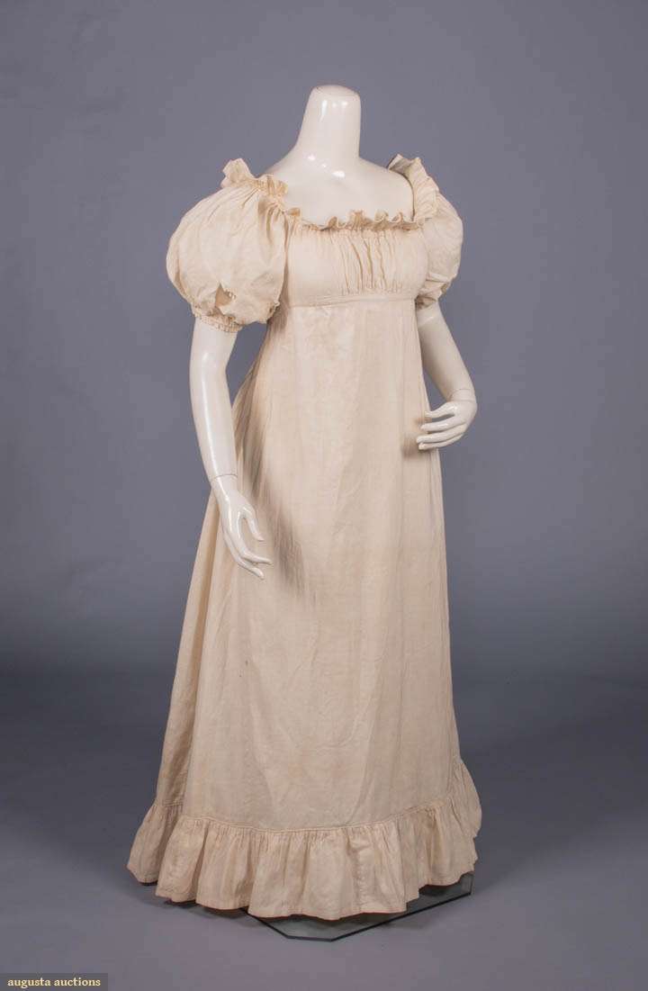 Un-dyed cotton dimity undergarment w/ low neckline surrounded by standing self ruffle, bodice w/ gathers at CF & across back, short puff sleeves gathered above elbow w/ drawstring, attached skirt w/ side gores, cartridge pleated across CB w/ drawstring closure, wide self ruffle at hem, B 45", W 34", L 49"-52", (3.5" x 1.5" & 1.25" x 1" tears right sleeve, tiny-0.75" dark spot stains, tiny-0.5" holes) good.