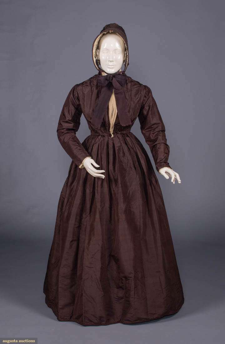 BROWN SILK TAFFETA DAY DRESS & BRIMMED BONNET, 1840s