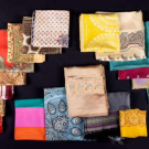 All European or Indian, most printed, 1 embroidered & 1 w/ woven stripe: 1 dark blue/grey striped w/ colorful ends & black fringe, Wd 32.75", L 29", (fringe messy); 1 long skinny rectangle w/ wide stripes, Wd 10.25", L 52", (few tiny pulls); 1 light brown w/ pink, yellow & blue embroidery, Wd 27.75", L 27", (light discoloration/spot stains, tiny-0.5" holes, edge wear); 1 cream w/ red & blue paisleys, Wd 34.75", L 35.75", (light stains/discoloration); 1 yellow w/ brown & white design, Wd 17", L 17", all good- excellent. From the Estate of Doris Duke, Newport Restoration Foundation.