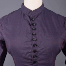 1-pc day dress of wool & silk w/ red warp & blue weft, stock collar, composition CF button closures, skirt in straight lengths, cotton hem facing, possibly Quaker, B 36", W 29", L 57.5", (4.75" tear CB above hem, underarm wear, large patches of fading in skirt, 2 dark stains above hem) very good.