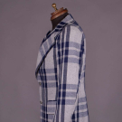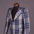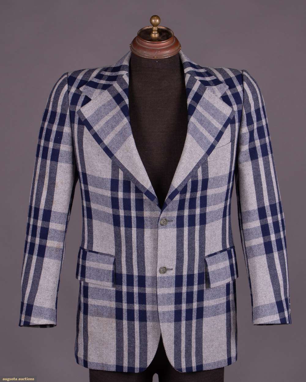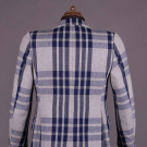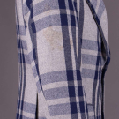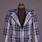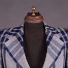 Twill wool blend in open triple striped plaid in shades of navy, grey & oatmeal w/ wide notched lapel, 2 CF button closures, printed “Pierre Cardin” lavender lining & label "Pierre Cardin Boutique Line, Paris, New York", CH 41", L 31", SH-SH 18", (light 6" stain to right sleeve, light generally wear) good.