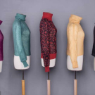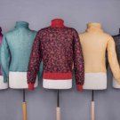 All mohair w/ turtlenecks & all but magenta sweater w/ label "Missoni Made in Italy": 1 magenta c. 1970, B 34", L 21.5" (unlabeled Missoni, light underarm wear); 1 blue-green c. 1978, label "Missoni for Bloomingdales", B 34", L 21", (few pulls, minor pilling, label detaching); 1 black & red w/ dense scrolling vine motif, c. 1988, B 40", W 24"-34", L 22", (pulls/pilling esp at SS's & sleeves); 1 pale yellow c. 1970, B 34", L 20", (few pulls, light 1.25" stain CF B); 1 black c. 1970, B 34", L 18.5", (label detaching, light underarm wear) all very good- excellent. Museum at FIT.