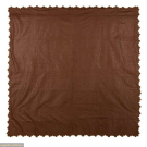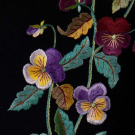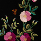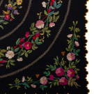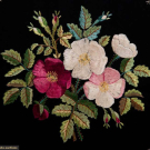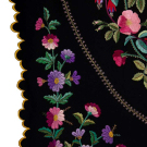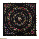 Black wool broadcloth table cover embroidered w/ ombre silk floss in graduated wreath of wild rose, fuchsia, pansy motifs separated with feather stitch rings, branching floral corner motifs 2 w/ bees, embroidered compound scallop edge, most likely American, 54” x 54.5", (very light wear at center fold line) excellent.