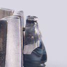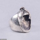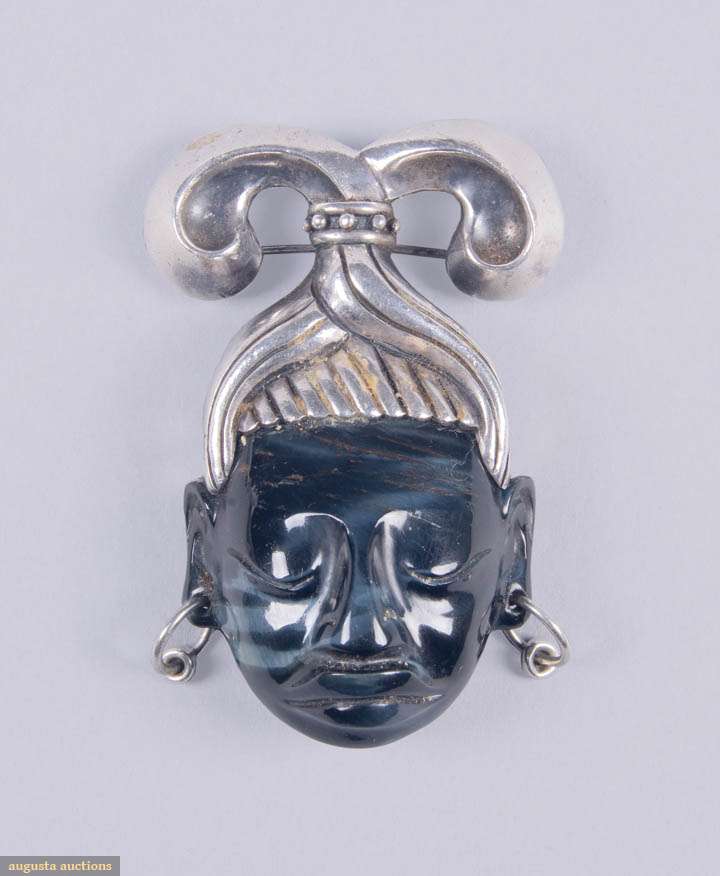 3-pc set sterling silver & (most likely) carved obsidian face motifs set into elaborate sterling headdresses from the Taxco silver workshop of Felipe Martinez: 1 brooch/ pendant, stamped "Sterling Taxco Piedra Y Plata", 1.5" x 3.75" x 1",(metal scratched/patina, dirty, few tiny dents); 1 ring, 1" x 1.25" x 1.25", band circ. 55 mm, size 7.5, (stone missing, scratched, tarnish, indents); 1 bracelet w/ simple box clasp, stamped “Piedra Y Plata Martinez Sterling Taxco 101", Wd 1.25", inner circ, 7", (tarnish, scratches, few tiny divots) all good- very good.