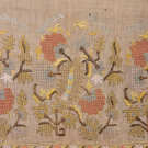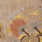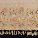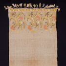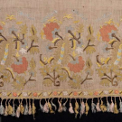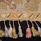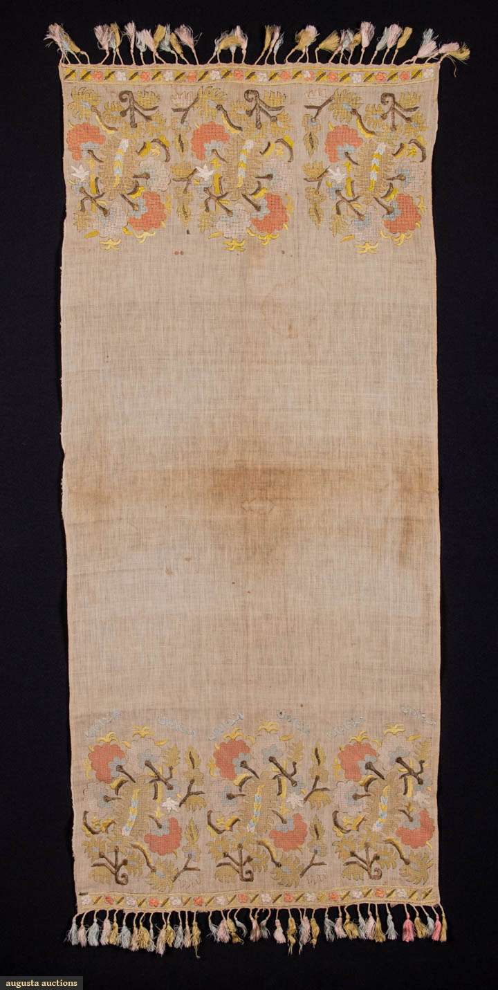 1 reversible towel, hand embroidered w/ silk drawn thread work & twisted gold thread in yellow, blue, green & salmon, inscription in blue silk thread, silk tassels, typically made for dowry, 20" x 49.5", (light staining/discoloration, tarnish/minor wear to lame, minor wear to tassels, some embroidery guidelines visible) very good.