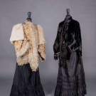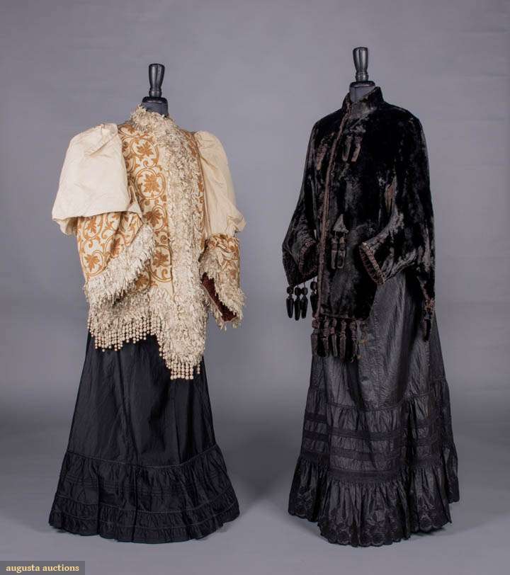 1 cream novelty weave taffeta w/ a raised serpentine rib, Corelli embroidered body in Medieval manuscript border motif, silk twill ribbon & thread fringe to collar, cuff & hem, row of silk covered graduated wooden beads w/ knots, B 42", L 25"-35", (sleeves shattering, tiny-0.25" holes, wear, few missing closures); 1 black silk plush dolman w/ self-covered glands, silk lining quilted in chevron pattern, SH-SH 17", B 36", L 26"-33", (velvet wear, few missing baubles, 1" right sleeve & cape join, worn cuff binding, 1.75"-6" seam openings/tears) both fair. From the Collection of A.T. Jones & Sons.