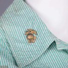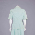 Two piece women’s green & white seersucker US Marine Corp Reserve uniform c/o button up short sleeve shirt w/ corporal insignia to left sleeve, brass Marine Corp studs shirt collar, insignia at left SH, 4 patch pocket all w/ shaped flap & Marine Corp composite button closures, CF Marine Corp button closures, matching skirt, summer 1945, label “Mary Dorothy West”, B 42.5", W 32", L 25.5", skirt W 28", L 29.5", (left collar pin bent, stain cluster near CF buttons, 1 button detached & incl, skirt hem unfinished & let down, taken in at W & fabric still present, few spot stains) very good. From the Collection of A.T. Jones & Sons.
