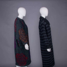 1 wool, alpaca & mohair blend double face knit w/ oversized rose motif, asymmetrical wrap front w/ large single forest green button closure, raglan sleeves w/ deep pocket inserted into seam, c. 1984, label "Missoni Made in Italy", B 54", L 47", (pilling, few pulls) very good; 1 wool black & grey checkerboard boucle, black asymmetrical ribbed knit wrap collar w/ tie closure & matching cuffs w/ thumb hole, deep H pockets, c. 1978, label "Missoni Made in Italy", B 46", L 47", (pulls, internal belt missing, tear in sleeve lining) excellent. Museum at FIT.
