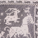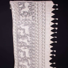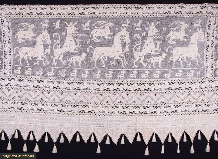 Curtain valance w/ mythological beasts, horses, stags, birds & dogs in drawnwork, bobbin lace, darned fillet & reticella, 17th C, 49" x 120.5", (numerous tassels removed & included, tassels probably a later addition, scattered tiny-0.25" holes, light discoloration to bottom edge) excellent.